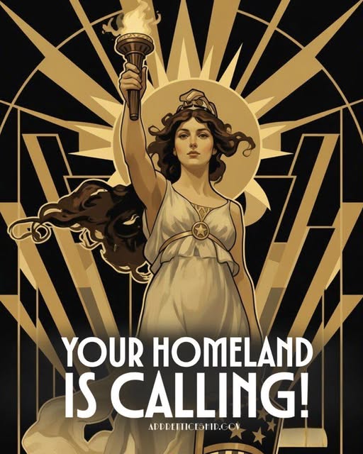 She’s also competing with Department of Homeland Security Secretary Kristi Noem for the social media graphics most likely to appeal to the Nazis among us. The graphics hearken back to the days when America was run by muscular white men who cut their hair, went to church and had obedient wives and children. Others are in the style of early 20th century propaganda posters. Union leaders have accused the department of a “rhetorical shift towards white supremacy” according to the Guardian.