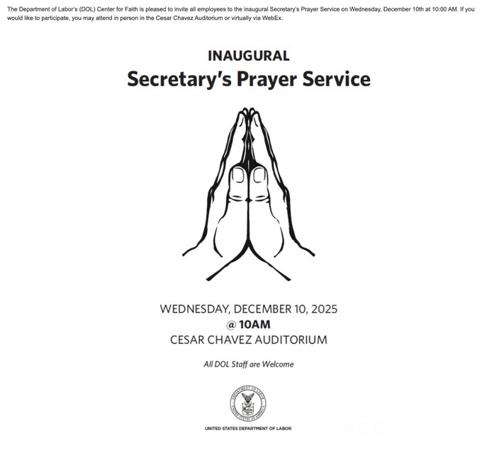 The last straw for many was Chavez-DeRemer’s first-ever prayer service for DOL employees shortly before Christmas. (A holiday celebrated by many Christians.)